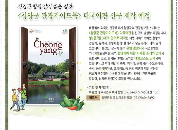 - 자연과 함께 살기 좋은 청양, <청양군 관광가이드북> 다국어판 신규 제작 예정