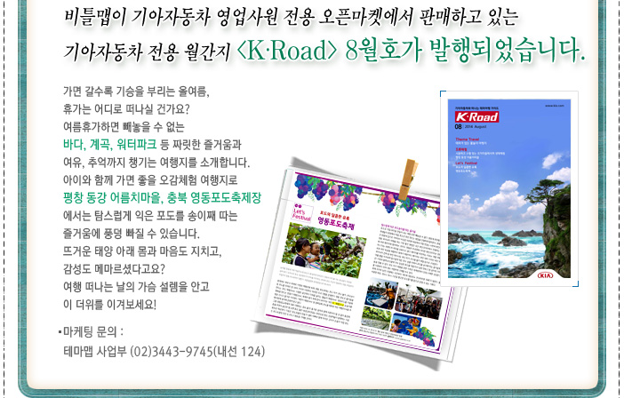 - 비틀맵이 기아자동차 영업사원 전용 오픈마켓에서 판매하고 있는 기아자동차 전용 월간지, <KㆍRoad> 8월호가 발행되었습니다.